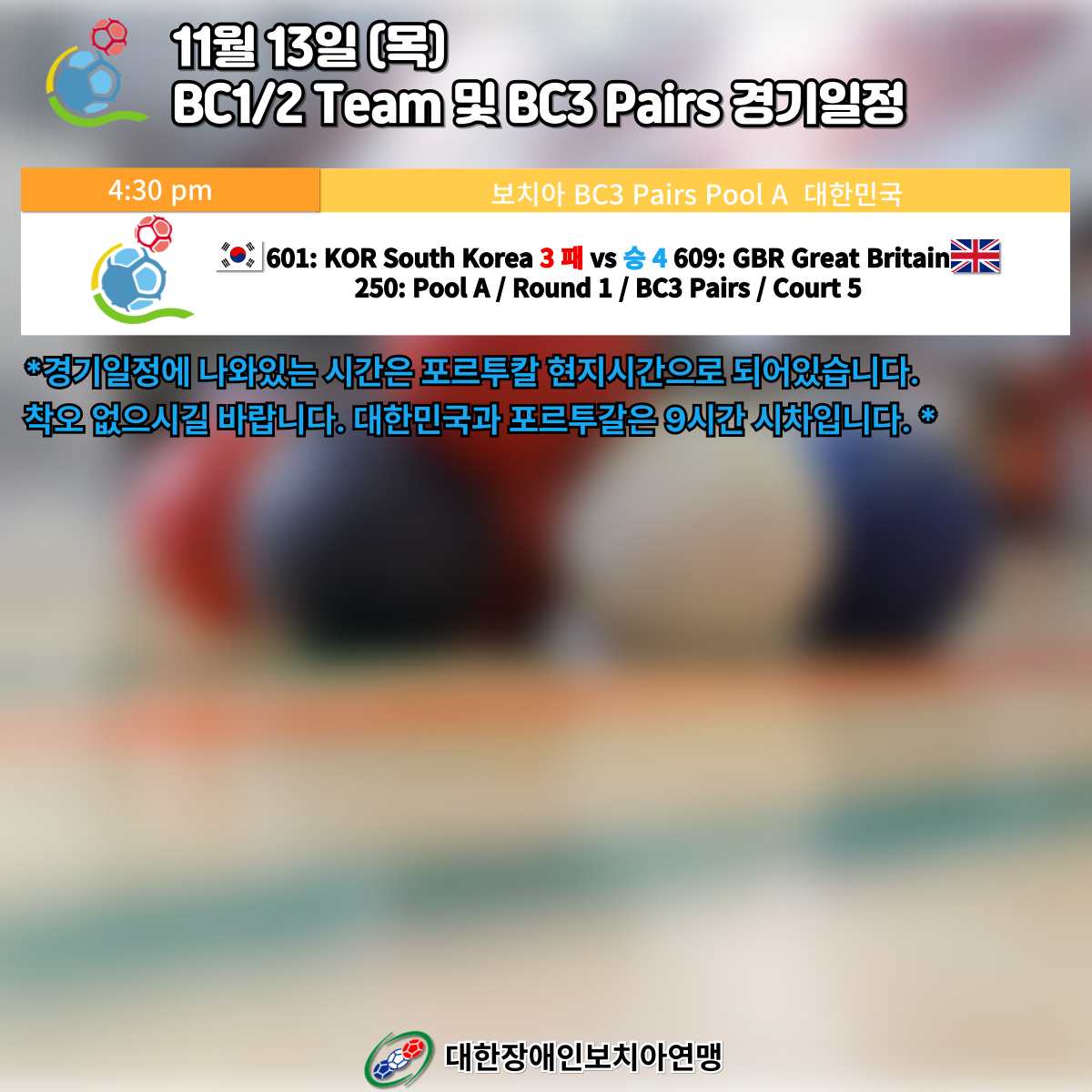 Coimbra 2025 World Boccia Cup 대한민국 보치아 선수단 11월 13일 (목) BC1/2 Team 및 BC3 Pairs 경기결과